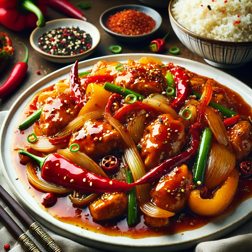 Juicy, tender chicken chunks are tossed in a bold Indo-Chinese sauce that’s perfectly spicy and tangy. Every bite delivers a rich burst of flavor, combining savory depth with a zesty kick for an irresistible experience.